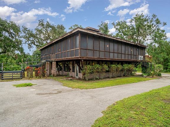 One or more photo(s) has been virtually staged. Welcome to your own rustic retreat tucked away on over 2 acres in South Lakeland! This one-of-a-kind home is full of character and charm, offering nearly 2,000 sq. ft. of living space across three levels and a layout you won’t find anywhere else. Elevated and surrounded by mature trees, the unique wood and brick exterior gives a treehouse feel with a wraparound screened-in porch perfect for relaxing and enjoying nature. Step inside and you’ll find soaring vaulted wood-beamed ceilings, gorgeous hardwood floors, and tons of natural light. The living room is massive and open, with rich wood paneling that continues into the kitchen and dining area. The kitchen offers plenty of cabinetry, original appliances, a built-in desk, and overlooks the scenic wooded property. The primary suite features stunning ceilings, a private ensuite bathroom, walk-in shower, and cozy details throughout. Additional bedrooms and bathrooms are generously sized with ample closet space, and there’s even a loft space with skylights and vintage charm upstairs. The ground level includes an expansive bonus space with a full kitchen setup, ideal for guests, entertaining, or even rental income. A large enclosed garage and extra storage space can also be found downstairs, on the main floor. This property also features a detached structure with a full sized bathroom inside. With 2.12 acres, you’ll enjoy privacy, room to roam, and endless possibilities—all while being just minutes from major roadways, shopping, dining, and everything Lakeland has to offer. Whether you’re looking for your next homestead, a creative investment, or just something truly special and different, this property is it! Schedule your once in a lifetime showing today! BEST AND HIGHEST BEFORE 10/20/2025!!