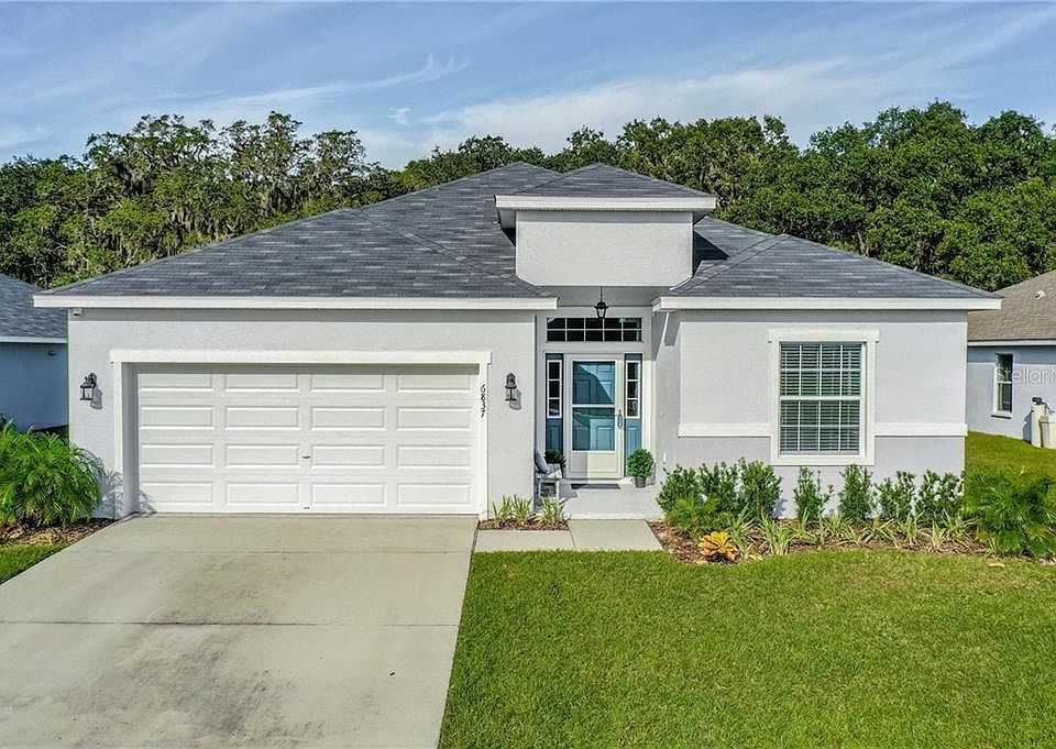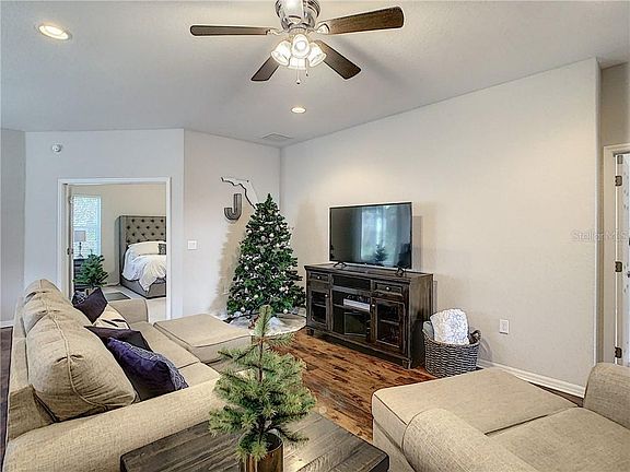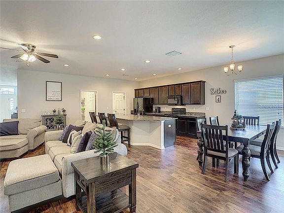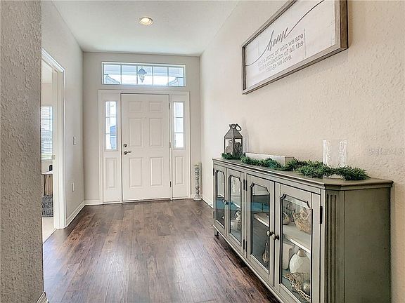 Like new and ready to move in! This home has everything today's buyers are looking for and more. Luxury vinyl plank flooring throughout the living areas, including the kitchen and bathrooms. Gourmet kitchen features rich 42" espresso cabinets with crown molding, lots of countertop space with an enormous eat-in island with sparkling granite countertops and a huge walk-in pantry. Large dining area has sliding glass doors overlooking the private screened lanai and backyard. Adjacent family room features extra LED recessed lighting and upgraded ceiling fan. Double doors lead to the elegant owner's suite with trey ceiling and walk-in closet. Attached private bath features double sinks separated by a relaxing soaking tub and a separate walk-in shower with upgraded tile. You will also appreciate the Culligan water softener that stays with the home. The second and third bedrooms share a jack and jill bathroom with double sinks and a separate area for the shower/tub and toilet. The fourth bedroom gets lots of natural light and makes a great office for working from home. The hall half bath is convenient for guests. Laundry room off kitchen has a drop zone, great for keys and mail. Keep an eye on every angle of your home with commercial grade security cameras and video monitor. Private backyard backs to conservation and the larger lot gives you more space between neighbors. All this in a great community with pool, playground and convenient to shopping. Hurry, at this price this home won't last long!