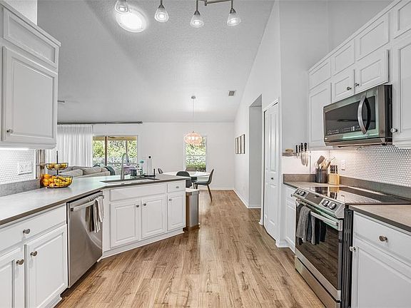 Welcome to this beautifully maintained 4-bedroom, 2-bathroom former model home in the highly sought-after Waters Edge community of Port Orange, FL. Set on a premium corner lot, this residence showcases manicured landscaping, a fenced yard, and borders a Nature preserve for a perfect blend of privacy and curb appeal. Inside, the open floor plan features raised ceilings, a formal dining room, and a chef’s kitchen complete with solid wood cabinetry, Silestone countertops, stainless-steel appliances, and both table and bar seating. From the open living area, sliding glass doors extend your living space outdoors to a screened-in porch, with an additional 400 sq ft paver patio, and custom pergola. This split bedroom floor plan ensures privacy and comfort for family or guests.The expansive master suite is a private retreat, featuring a custom Closet By Design system and a large ensuite bathroom. This home has been thoughtfully upgraded, including: double-pane windows (2018), HVAC system (2020), pergola (2021), and fresh interior paint (2025). Additional practical features include a full irrigation system, gutters, front storm door, and hurricane shutters on all windows, doors, and sliders. Water's Edge is one of Port Orange’s premier communities, known for its top-rated schools, tranquil surroundings, and family-friendly atmosphere. Located less then 15 minutes from the Beach and surrounded by top ranked Golf Courses. Schedule your private tour today!