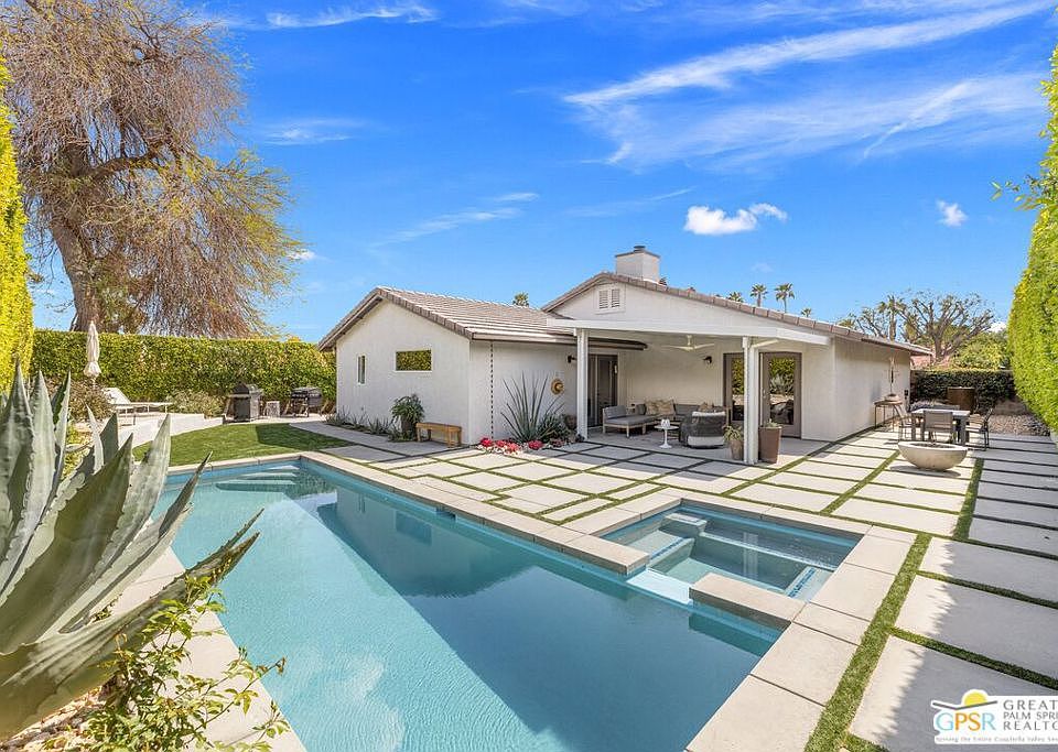 FANTASTIC opportunity to own and enjoy a beautifully maintained ultra-private home in the Panorama Park neighborhood. Tall ceilings, updated finishes, NEWER POOL + SPA in PebbleTec, and a fabulous floor plan begin to tell the story. PRIDE OF OWNERSHIP shows up throughout including newer HVAC, stylish fixtures + finishes, and OWNED SOLAR. Living and formal dining rooms frame the updated kitchen with counter seating. The feel is open and airy. Loving the ceiling height, fireplace, and French doors opening from living room to pool and patio. Outdoor living is tops with the mix of conversation areas including a fun raised chaise lounge area with dramatic San Jacinto VIEWS to the West, a perfect place to watch the sunset. There's updated landscape and hardscape, a modernist fire pit, and sleek new Alumawood patio cover. The strategic drainage plan and custom gutters are a nice surprise and the "deco rain-chain" speaks to the attention to detail found all around. Heading back inside, the Ensuite Primary delivers vaulted ceilings, French doors to the patio, updated full bath with dual vanities, and a large walk-in closet. Vaulted ceilings continue into Guest Bedroom #2 and Guest Bedroom #3 which is currently enjoyed as an office. Adjacent full bath lines the central hall where there is also a laundry closet. Take the Matterport VIRTUAL TOUR for a better sense of flow. The best of Greater Palm Springs is a short hop away and the quick access to I-10 is a good thing as well. Side note, locals say Panorama Dog Park is THE BEST in the valley! Enjoy it all.