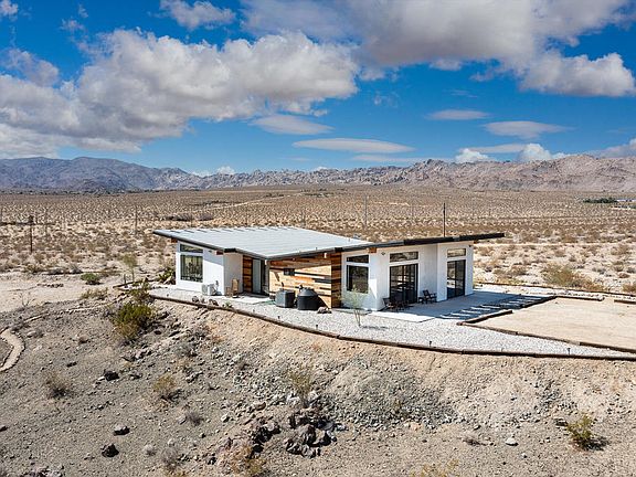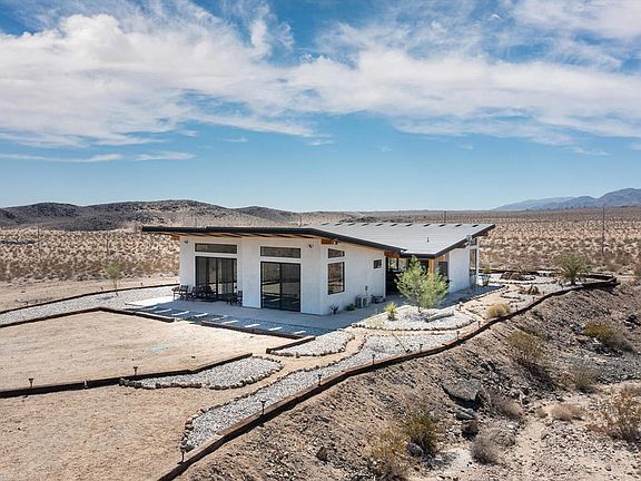 Top 10 View Home! Inspiring butterfly architectural modern construction, perched on 8+ acres of unsurpassable panoramic hillside enchantment and directly adjacent to thousands of acres of open space government land for hiking and exploring. This permitted STR is eligible for a new permit. The design evokes a serene spirituality against the backdrop of Copper Mtn. One of the most stunning views in Joshua Tree. 2,385 sf, 4 beds & 3 baths including ADU, and attached guest house. Spacious living room with high vaulted ceilings, walls of glass, recessed lighting, laminate floors AC-mini splits, fireplace. Open concept kitchen with pendant lighting, island stove & breakfast bar. New stainless steel appliances, refrigerator, oven, cook top, microwave plus expansive dining area ready to entertain may guests. Master bedroom features a walk in, custom made shower with sitting bench & insets adorned with marble & tile & glass. Glass slider leads to the scenic hilltop patio with desert landscaping of rock, pebble stone, boulders, concrete slab, cactus, round pool, & several lounge areas. Skyline vistas of the Bullion Mtns, the Little San Bernardino Mtns, & the Sheephole Mtns which often glow red during golden hour. Additional patio space with large partially enclosed & covered dining & bbq area. Your guests will feel like they are experiencing a desert dream. Attached 1 bedroom casita. Detached ADU with kitchen, dining area, large windows, private patio & 2nd set of washer/dryer.