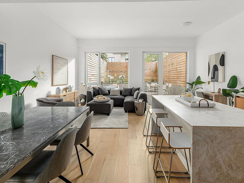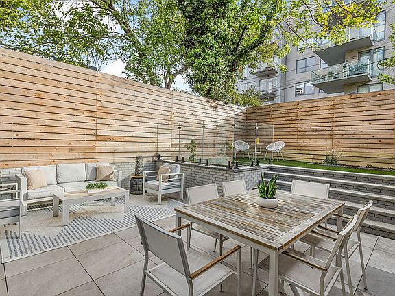 The first floor offers an open concept living and dining area with a beautifully designed private patio and backyard accessible directly off the living space. This area is fully enclosed with extra-high privacy fencing and offers a seamless transition from indoors to outdoors -ideal for entertaining, gardening, or simply relaxing in peace. A half bath and sizable under-stair closet add additional convenience.