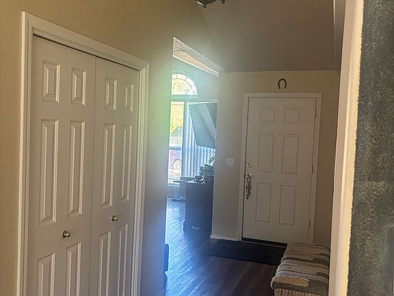 The welcoming entry with vaulted ceilings and a chandelier sets a grand tone. Enjoy an updated kitchen with a gas range, refrigerator, microwave, dishwasher, hardwood flooring, a breakfast bar, and a formal dining area.