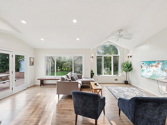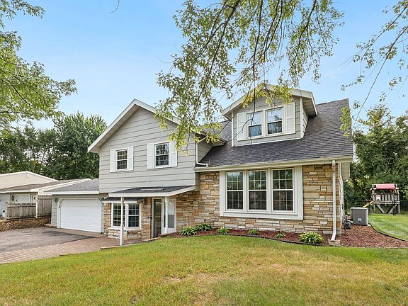This is the one! Welcome to this beautifully maintained 5-bedroom, 3-bath home offering over 2,500 sq ft of comfortable living space in the heart of Fridley. Step inside to an oversized kitchen featuring a unique peninsula countertop and cabinet space galore—perfect for entertaining or casual dining. The kitchen flows seamlessly into a vaulted living room filled with unique architectural angles and natural light from large windows, creating a warm and inviting atmosphere. The spacious layout includes generously sized bedrooms throughout, including an oversized owner's suite with a private en-suite bath. Enjoy the best of indoor-outdoor living with a walkout from the living room onto a maintenance-free deck, leading to a stunning stamped concrete patio—ideal for relaxing or hosting gatherings. The backyard is a peaceful retreat, enclosed with mature trees and fencing for added privacy. All this just minutes from downtown Minneapolis, offering a quick and convenient commute.