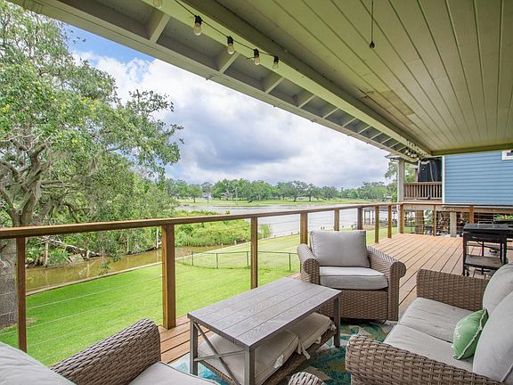 Welcome to the river! Nestled along the San Bernard river, this charming 3-bedroom, 2-bath home offers peaceful views and thoughtful design throughout. Tile and hardwood flooring flow seamlessly across both levels. The main-floor primary suite features a spacious walk-in closet with built-in storage and an ensuite bath with a relaxing tub/shower combo. Upstairs, two bedrooms share a convenient Jack & Jill bath with a shower-only setup. Enjoy river views and a breath of fresh air from the roomy space on the full-length balcony. The kitchen is both functional and inviting, with an island that encompasses the dishwasher, sink, and additional seating perfect for casual meals or entertaining. Additional highlights include built-in shelving throughout, a well-equipped laundry room with folding station and storage, a bright, open layout that brings the outdoors in and a new roof in 2024!. Perfect as a full-time residence or weekend escape.