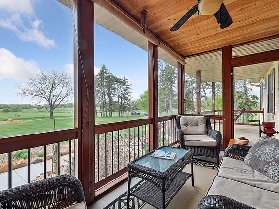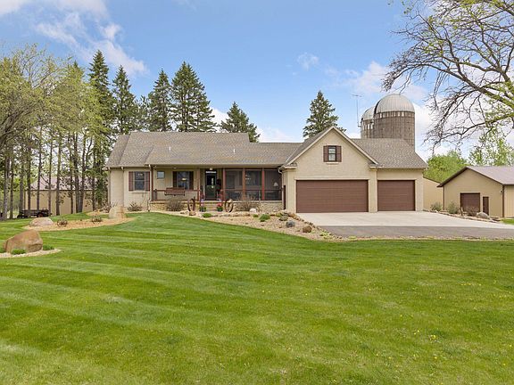 Nestled on 11 acres of serene land, this custom built rambler is the epitome of luxurious country living, yet a short commute to the cities. The home itself has been lovingly designed and crafted with the utmost attention to detail, using only the highest-quality materials and construction techniques. Gorgeous hardwood hickory floors, custom oak cabinetry and high-end appliances, central vac system, new water heater, water softener and Leafguard gutters. The kitchen has 42” oak cabinets, top of the line stainless appliances and Corian countertops. The primary suite has an ensuite bathroom with claw foot tub, separate shower, dual vanity sinks & make up vanity, and ceramic floors/shower. The lower level offers two more bedrooms, a huge family/entertainment, locked safe room and bathroom. In addition to the main house, the property includes FOUR outbuildings for business, renting, animals, etc. New septic system being installed!