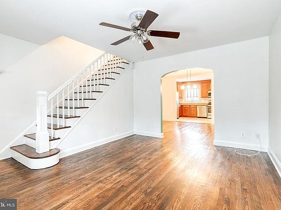 If you are looking to live in a classic Baltimore "Charm City" neighborhood, then look no further! This adorable Dundalk rowhome has been tastefully updated while maintaining it's classic charm. There is a front porch where you can enjoy a morning cup of coffee while you chat with your neighbors. When you walk through the front door you will be greeted with gleaming hardwood floors and an archway leading into the oversized dining room where you can host holiday dinners. The dining room is opened up to the modern kitchen with granite counters, stainless steel appliances, a custom tile backsplash, ceramic tile flooring, recessed lighting, and mils of cabinet and counter space. Upstairs you will find a sleek primary bedroom with moody dark walls and plenty of space for all your furniture. The 2nd and 3rd bedrooms are a generous size and all of the bedrooms have ceiling fans and share a renovated full hall bath with custom tiling, and a newer vanity. The lower level is a perfect man-cave or playroom space. There is an additional full bath in the basement as well. This could even be a home office space, craft room, or anything you can imagine. Enjoy a summer BBQ outside on the covered paver patio surrounded by a fully fenced yard. There is even a space behind the fence for 1 car parking. Welcome home!