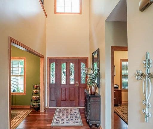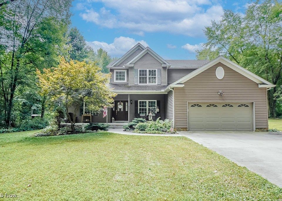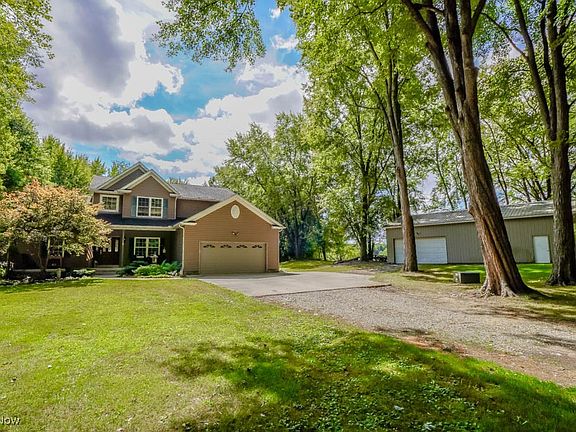 Set on nearly 7 acres in a private, wooded setting, this custom built colonial offers 2909 square feet of living space, along with outstanding garage space including a two car attached plus a 28 x 46 pole building that can fit up to four more vehicles! A wide front porch welcomes you inside to a two story foyer with cherry hardwood floors, set between the formal dining room and a home office. At the center of the home, the great room impresses with its 18 foot ceiling, floor to ceiling stone fireplace, and windows that frame wooded views. The kitchen features KraftMaid maple cabinetry, under cabinet lighting, stainless steel appliances, a walk in pantry, and an island with counter seating. Just steps away, the vaulted sunroom with skylights and tile flooring opens to a stamped concrete patio and tree lined backyard.