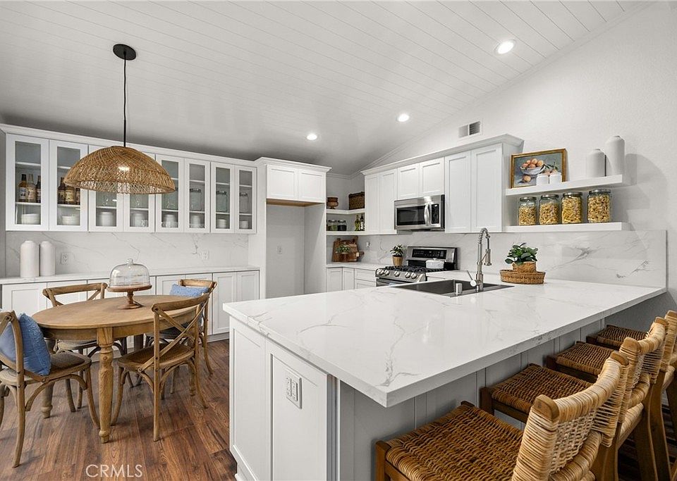 - Beamed Ceilings, Breakfast Bar, Built-in Features, Cathedral Ceiling(s), Eat-in Kitchen, High Ceilings, Open Floorplan, Quartz Counters, Recessed Lighting, See Remarks, Unfurnished, All Bedrooms Down, Bedroom on Main Level, Main Level Primary, Primary Suite