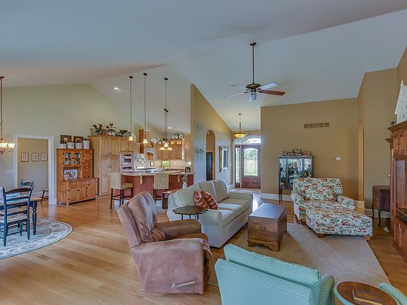 Custom built for a contractor, this tastefully appointed home is in impeccable condition and maintained to perfection. Extra well thought out mechanicals throughout and the decor is delicious! Open concept with 9' & vaulted ceilings, granite surfaces, top level SS appliances, custom cabinetry, kitchen island, two disposals, breakfast bar. 4" oak hardwood floors throughout, ceramic floored baths. Gorgeous window treatments and area rugs. Solid core doors,wide baseboard trim, crown moldings. Lennox Elite 90% high efficiency HVAC w/air purification system & reverse venting system. Multiple vacuum systems (house & barn) hot water circulating system. Venture out to the open deck and pergola to view the beautiful & professionally landscaped yard. 3 car detached garage 27x24, plus separate 34x25 Gambrel Barn designed by the owner. Potting Shed 8x16 w/laundry tub & running water. Outside are 8 raised beds within a fenced 32x32 area with their own watering system. 20 acres of beauty and privacy sure to please the most discriminating buyers.