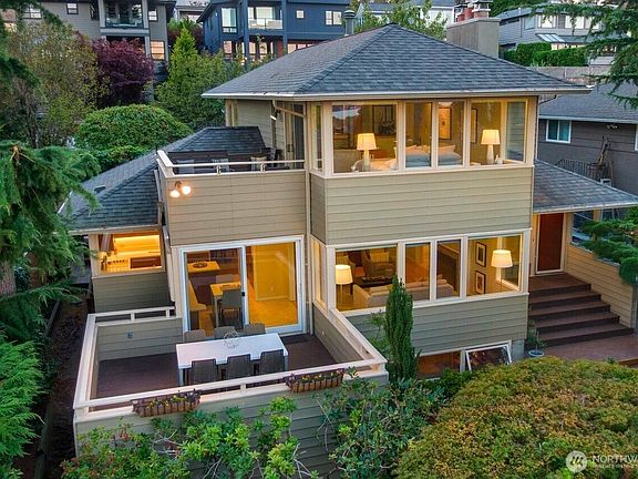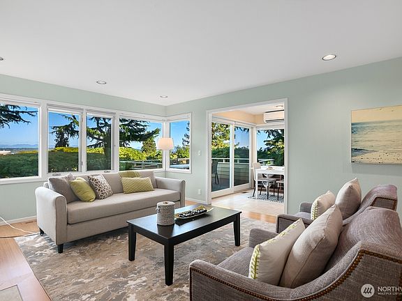 Stunning mid-century remodel in walking distance to Magnuson Park provides extraordinary views throughout. Kitchen has Subzero and Miele appliances with a dining deck overlooking Mt. Rainer. Unique floorplan provides ADA accessible living on main floor with a private 3-room suite including study, bedroom and full bathroom. Large primary bedroom has sweeping views, wood burning stove, & viewing deck. Wake up to Mt. Rainer & watch the fireworks from bed! Lower level provides a family room, bedroom & bathroom along w/ large workshop & storage area. Main floor has formal dining room that opens onto a private patio & conversation pit. Lush landscaping & flowering plants throughout. Bike locker, outdoor carport, storage sheds & 2 on-site parking.