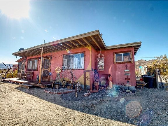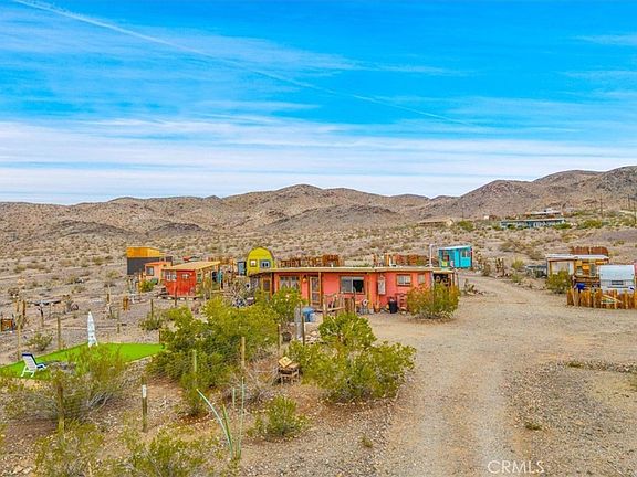Incredible Opportunity to own a very UNIQUE & One-Of-A-Kind desert property just MINUTES from Joshua Tree National Park. This artistically revived 1958 homesteader is nicely situated on 2.5 acres of land with multiple multi-use outbuildings and stunning panoramic desert and mountain views. The main cabin adorns warm wood flooring, a brand new Mini-split, a lovely wood-burning fireplace and several large windows that let in an abundance of natural light. The quaint kitchen and dining area features a charming built-in dining nook, mounted shelving and hand-built cabinetry. The bathroom is anchored with a large clawfoot tub to soak the day away and the primary bedroom has a cozy cottage feel with a connected enclosed outdoor porch (the perfect spot to enjoy a morning cup of coffee).