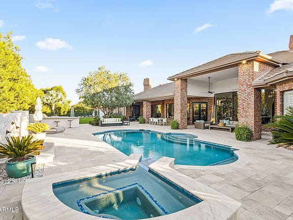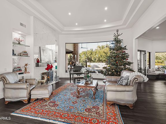 Situated on a quiet cul-de-sac in the heart of Paradise Valley, this exceptional estate presents a rare opportunity to own a highly versatile property in one of Arizona's most sought-after locations. The main residence features an open-concept design that seamlessly connects the family room, chef's kitchen, and formal dining area. Walls of glass sliders flood the home with natural light and create an effortless indoor-outdoor living experience. The chef's kitchen is thoughtfully appointed with a large island, breakfast nook, butler's pantry, and a striking glass, temperature-controlled wine room, ideal for both everyday living and entertaining. The primary suite serves as a private retreat, complete with a fireplace, dedicated den, spa-inspired bath with dual vanities, oversized shower, separate soaking tub, and a generous walk-in closet. Multiple bonus rooms provide exceptional flexibility for a playroom, home gym, or private office, in addition to a separate living room. A separate guest house offers outstanding versatility for multi-generational living or extended guest stays. It includes two bedrooms, a full kitchen, dining and living areas, laundry, a walk-in closet, and its own private garagedelivering comfort and privacy. Enjoy mountain views from the resort-style backyard, which enhances the main home with a heated pool and spa, water feature, built-in BBQ with island, and ample space for entertaining. A dedicated sport court features a basketball hoop and pickleball setup for year-round recreation. Additional highlights include a three-car garage for the main home and a thoughtfully designed layout that balances elegance, functionality, and privacy. Ideally located near top resorts and spas, championship golf, fine dining, and premier shopping.