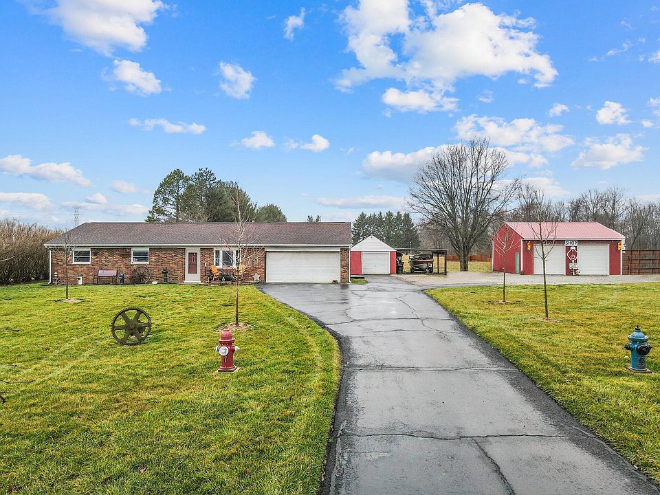 Come take a look at this lovely 3 bedroom 1 1/2 bath ranch nestled on a 3 acre lot with a 36 x 36 additional heated pole barn. The home offers a spacious kitchen with ample counter and cabinets, living room, family room that is currently used as a 4th bedroom, sizable bedrooms and large full bath with dual sinks. The home offers oversized attached heated garage, an additional building with lean-to and huge heated pole barn. Updates include New A/C in 2022, New furnace in 2020, tankless water heater in 2022, new Water softener in 2022, new refrigerator in 2022, fresh paint throughout, whole house generator, Roof new in 2013, new furnace in Pole barn in 2022 and new furnace in attached garage in 2022.