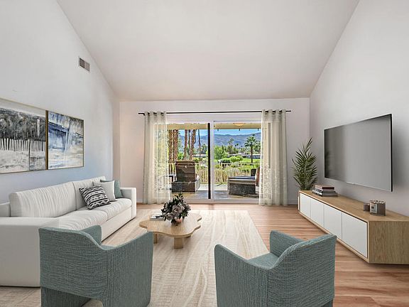 Rare Find in Cathedral Canyon Country Club!Located in a gated golf and tennis community, this elevated home offers stunning views of the pool, lake, mountains, and fairways. Enjoy expansive patios perfect for sunsets, morning coffee, or grilling the perfect steak. A private garden courtyard leads into a stylish 2-bedroom, 2-bath retreat--freshly painted and featuring new luxury vinyl flooring, baseboards, kitchen appliances, and energy-efficient windows. Turnkey and ready for immediate enjoyment, this open-concept home invites casual dining and relaxed entertaining. Both bathrooms are filled with natural light, and the primary suite opens to a peaceful patio for ultimate relaxation. Amenities include an 18-hole championship golf course, tennis facilities with professional instruction, an on-site restaurant, and vibrant seasonal social events. Conveniently located near fine dining, upscale shopping, Palm Springs Airport, and the CV Link--a 40-mile recreation pathway for walking, biking, and golf carts. Golf Cart Included with property !!