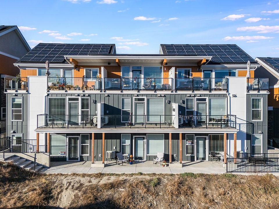 Modern, Affordable Living Beside Knox Mountain! Discover the perfect blend of nature and convenience in this beautifully designed 1-bedroom + versatile den townhome, built in 2022 and ideally located in sought-after Glenmore — just steps from Knox Mountain Park & Trails and less than 10 minutes to downtown Kelowna. With a bright south-facing view, this contemporary home feels brand new, showcasing a warm, light colour palette and thoughtful finishes throughout. The den offers flexibility as a guest room or home office. Enjoy eco-friendly comfort with solar-powered heating and cooling, sustainable green energy features, and smart data centre upgrades that make this home as efficient as it is stylish. The development is pet and rental friendly, allowing up to two big dogs, two cats, or one of each, and includes one parking stall with additional street parking nearby. Whether you’re a first-time buyer, downsizer, or investor, you’ll love the harmony of modern living and outdoor adventure — surrounded by hiking and biking trails, serene lake views, and the vibrant energy of downtown just minutes away. Don’t miss your chance to own in this unique stacked townhome community — offering a refreshing alternative to typical condo living, where Kelowna’s natural beauty meets contemporary convenience.