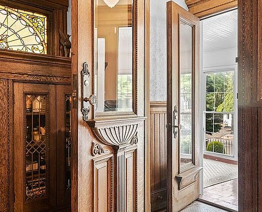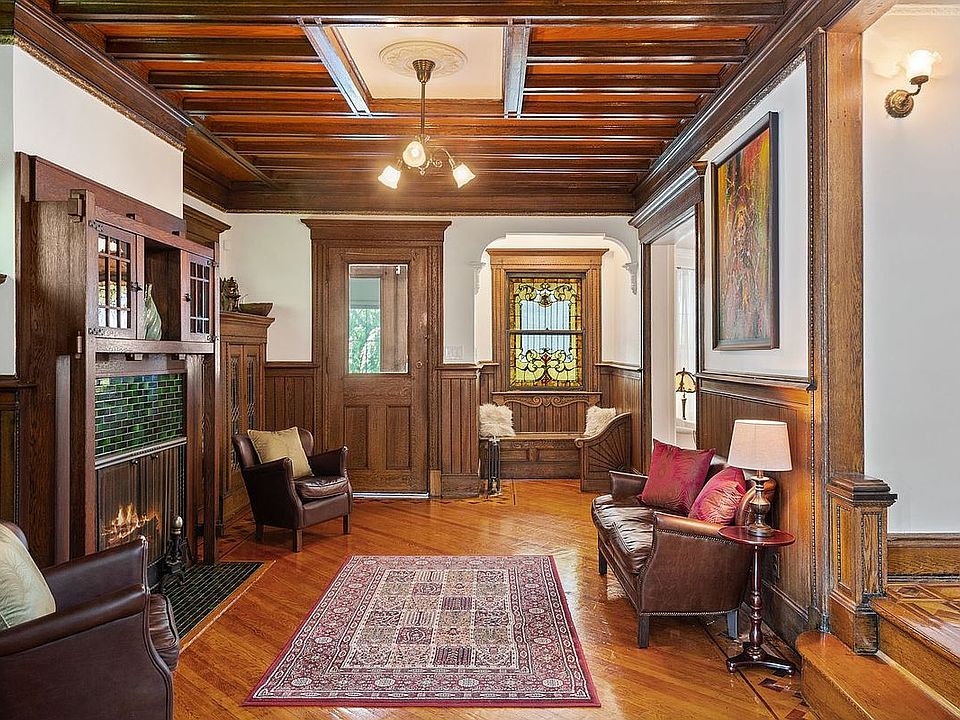 Two, beautiful, original sets of oak and glass doors welcome you into the stunning entry foyer where breathtaking original detail surrounds you. Coffered ceilings, a fireplace with an Arts and Crafts mantel flanked by leaded glass built-ins with intricate stained glass windows above, multi-patterned parquet floors, and the original Engelnook with built-in storage benches. Off of the foyer is the living room with a bay of windows overlooking the tree lined street and beautiful, delicate plasterwork on the ceiling. The foyer flows into the elegant dining room (big enough for a table that seats 8 or more) with another fireplace with ornately-carved mantel, tall wainscoting with the original anaglypta insets, and another stunning stained glass window.