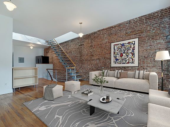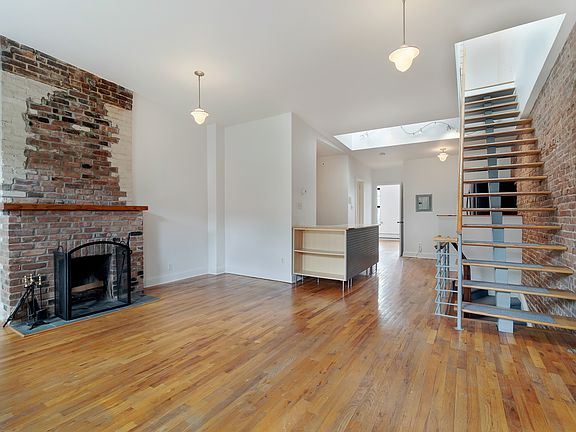 Fantastic upper duplex in with 2 large bedrooms, and 2 private roof decks in a Park Slope townhouse! This spacious and loft-like home is super sunny with 3 windows across the living room and a skylight bringing light from above. Details like an open staircase, exposed brick and super high ceiling give an industrial vibe. While a coveted WORKING wood-burning fireplace completes the charm. The bedroom on the main level also has three windows and is the full width of the building - pictured virtually staged as an office. The kitchen is both tucked away and centrally located with an island open to the main space for extra counter space and sitting/eating. One bathroom with a tub is located on this level. The upper level is roomy and bright with sliding glass door on two sides. You'll enjoy easy access to both of your outdoor spaces as well as a cool cross breeze is here. The roofdeck facing front is 500 square feet and faces South for year round direct sunlight and ideal for flowering plants. A back deck, is more secluded with views of Downtown Brooklyn's skyline. Pets are allowed on a case by case basis. There is laundry and bike storage ( E bikes not permitted) in the building's basement shared with only 1 other tenant . Note *some photos are virtually staged*