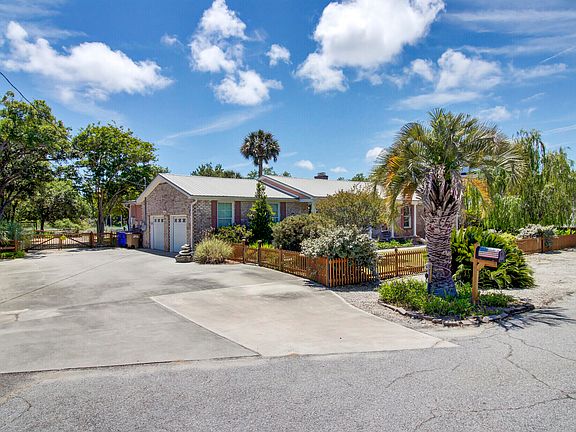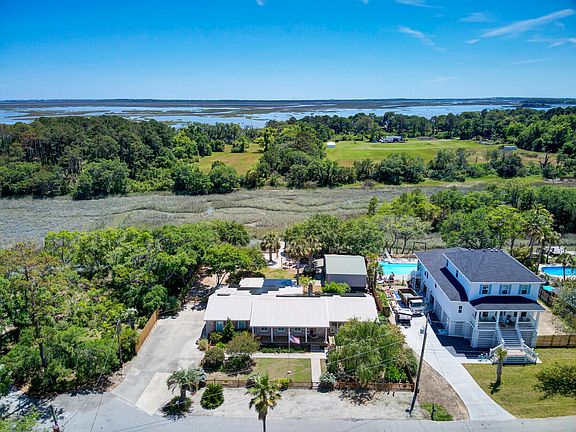 On beautiful and sought-after James Island, this lovely home of Old Charleston brick exudes southern charm with modern updates, in a highly desired location. As you pull into the end of the cul-de-sac, take notice of the beautifully landscaped yard, a lover of the outdoors will certainly enjoy the play/work space it naturally provides, with attractive custom fencing and beautiful blooming trees, bushes and bulbs. Enjoy sitting in a rocker or swing on the wide, columned front porch, and take in the wonderful scent of flowers in the spring from Southern gardenias, jasmine, Ligustrum, and more! As you walk in the front door, you'll be wowed by the elegant living/dining combined room, which will has space enough to hold a sofa and chairs, upright piano, and a dining table for eight!Flooring inside the home boasts beautiful hardwoods and tile throughout. As you enter, notice elegant crown molding, chair railing, and an abundance of natural light from multiple large windows in each room. The massive kitchen is a stunner: gorgeous custom-built natural maple cabinetry with beveled glass and inlays, floor to ceiling, with a huge island. Fabulous bespoke quartz for the countertops, large drawers, and pull-out shelving in cabinets. Talk about counter space and storage and the kitchen includes a large bump-out area that seats six! With a full-home AquaOx filtration system installed, pure chlorine-free filtered water runs through every pipe in the house. The kitchen opens to the den, which boasts a brick fireplace, gas insert, and custom-built oak cabinets/shelving, creating a warm energy and flow great for entertaining. Enjoy the private bump-out office or 4th bedroom, with large windows that view the richly landscaped, fenced back yard on three sides. The adjacent Carolina room/back porch includes hurricane shutters and screened windows with tinting. Virtually every room (even the large laundry room) has a ceiling fan with lights. Windows in the home are double hung, with tinting and wide blinds or shutters. For the energy-conscious, the home comes with solar panels on the rear of the 40-year metal roof, bringing down your monthly energy expenses. There is a huge driveway (room for your boat trailer and/or RV) and a 2-car side-entrance garage with high ceilings, insulated doors, and extensive wire shelving. This beautiful home might have the most private backyard in Charleston! Situated next to a wooded lot which acts as a most luxurious privacy fence, the backyard has expansive marsh views. Enjoy your walk-out dock with hydraulic boat lift and stone battery wall to the water (no ugly mud slope) replete with low slatted fencing to preserve the view. Notice the massive pole barn in the back yard with a full kitchen, including hot/cold water sink and a gas stove! Tremendous storage and room for an "outside den," or gym/exercise room, with pegboards for tools and a garage door for access. There is even adjacent shed: enclosed, attached and excellent for power tool storage. In addition to the dock and boat lift, there is a fish-cleaning station with roof. For the vegetable gardener, there is a huge raised bed with the richest soil you've ever seen. This gorgeous home is nestled in a lovely established neighborhood on James Island you will be only minutes to the beaches one way, and minutes to colonial Charleston the other way. Southern charm with oaks and flowering trees and a beach vibe what a wonderful combination.