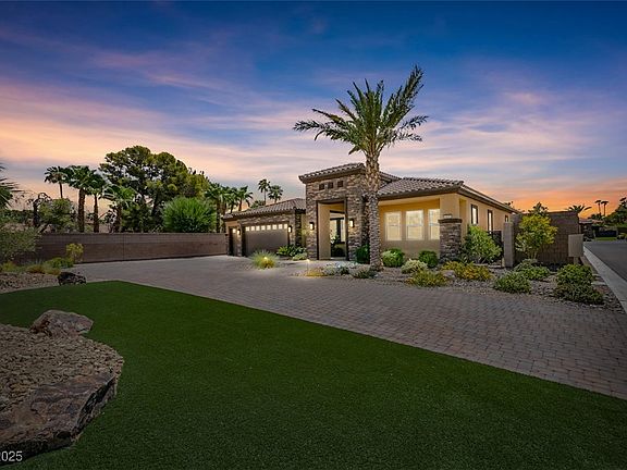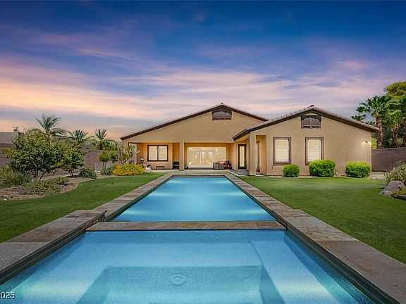 DAY or NIGHT, this home has quick access to world-class entertainment, sports, dining, airport access, and shopping—yet still your own desert retreat. Situated on a rare lot, this single-story estate, built in 2021, offers exceptional design, privacy, and convenience. Interior highlights include upgraded countertops, designer tile, lofty ceilings, luxury stainless steel appliances, a gourmet kitchen with butler’s pantry, surround sound, laundry room with sink and cabinetry, upgraded electrical features, custom double side-yard gate, and spacious garage. Each of the five bedrooms is a private suite with direct bathroom access. Enjoy mountain views from the backyard oasis, too. Come and see for yourself how to live, relax, and entertain on nearly an acre in Las Vegas! The stackable sliding doors open to reveal a unique view of the pool, spa, fire feature, and entertainer’s yard.