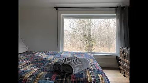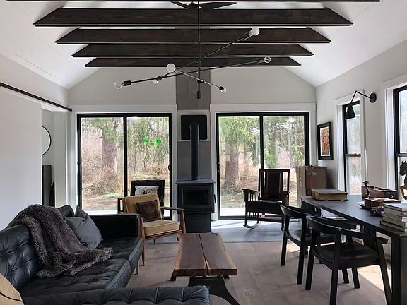 Beautifully designed, fully furnished home surrounded by trees, perfect for a peaceful winter stay. The home features a spacious open living and dining area with large windows, a wood-burning fireplace, and a modern, fully stocked kitchen.