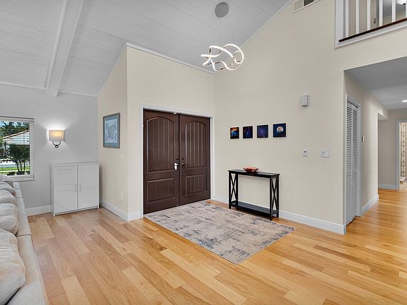 Welcome to your dream home in the highly sought-after Estancia South community! This completely renovated 4-bedroom, 3-bathroom residence blends modern design with luxurious comfort. Step inside to soaring vaulted, wood-paneled ceilings and an abundance of natural light streaming through high glass and skylights. The entire home features new engineered flooring, creating a warm, contemporary feel throughout. Designed with functionality and elegance in mind, the kosher kitchen includes a double sink, two dishwashers, a KitchenAid wall oven and microwave, and a sleek induction cooktop ideal for both everyday cooking and entertaining. The spacious downstairs includes a massive built-in playroom, one generous bedroom, and a full cabana bathroom. Upstairs, the expansive primary suite features a large bathroom, two walk-in closets, and custom built-in storage. Two additional bedrooms and a stylish full bathroom complete the upper level. Outside, enjoy your own private backyard oasis with a newly remodeled heated pool, travertine marble deck, a cozy fire pit, a covered sitting area, and a lush grassy area perfect for play or relaxation. Additional highlights include: features a new 2021 roof and gutters, impact doors and most windows, and ring security system. A short walk to the private Estancia sports park with Tennis, pickleball, covered playground and a basketball court. Very close to house of worship. This home offers the perfect combination of convenience, community, and modern luxury. A must-see to truly appreciate!