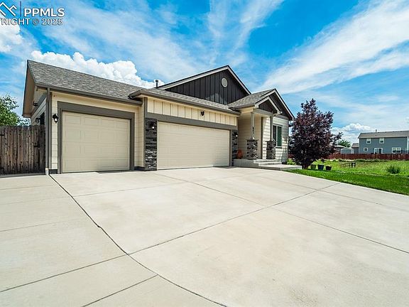 This home truly offers main level living and is ideal for multigenerational needs! Featuring an open floor plan and generously sized rooms, this home presents an impeccable balance of comfort and luxury. Enter and enjoy elegant hardwood flooring that extends throughout the foyer, kitchen, dining area, and great room. The main level comprises three bedrooms and two bathrooms, offering ample accommodation for both family and guests. The great room serves as an excellent space for gatherings and entertaining, while the adjacent kitchen is a culinary enthusiast's dream. You will find yourself enamored with this remarkable kitchen, which includes a substantial island, granite countertops, tall cabinets, and stainless-steel appliances. The oven simplifies cooking, while the extensive counter space ensures that you will never lack room to prepare your favorite dishes. The main level master serves as a sanctuary in its own right and has a charming barn door. Indulge in the opulent five-piece master bathroom, featuring a dual granite vanity, a soaking tub, a separate shower, and a spacious walk-in closet. The finished basement is spacious and provides multiple options for use and enjoyment; encompassing a large recreation room, two extra bedrooms, a bathroom, and storage! Enjoy a three-car garage with sheetrock walls and epoxy flooring, offering a neat and organized area for all your vehicles and belongings. Additionally, the fenced-in backyard guarantees privacy and space for outdoor activities and is unique With open space situated behind and alongside the right of the home. ***ROOF replaced in 2024****Lorson Ranch offers wide open skies, mountain views, and a strong sense of community! Located just minutes from multiple military bases, this growing area is perfect for military families and anyone seeking modern homes and parks, trails, and new schools nearby!