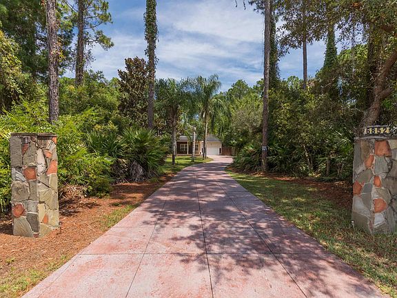 Kick back and enjoy the privacy of this uncrowded area just five minutes to the beach. The long driveway makes a lovely entrance with palm trees and an impressive stone & wood wall border. Enjoy relaxing on the covered front porch, and soak in the Florida lifestyle. Once inside, the downstairs has an inviting open floor plan with beautiful cherry wood floors in the living area as well as a second bedroom with ensuite bathroom. The spacious kitchen offers plenty of storage. Two bedrooms open out to the pool and deck. Catch lovely breezes with the many doors and windows open. The upstairs sports bar overlooks the fireplace and the living area below, and leads to the master suite complete with laundry chute. The high ceilings, natural light, open staircase, covered porches, custom pool with hot tub and fire pit area invite you to entertain or relax. The detached garage will be a gathering place of its own with black and white tiled floor and diamond plate cabinets, and invite the guests to stay in the upstairs fourth bedroom/guest suite. It has a non-conforming half bathroom. There is an outdoor shower with sink behind the garage. The home is perfectly positioned as a primary residence or rental with no nightly minimum. The home is offered furnished. There is space for an RV, boat and toys on this oversized lot. The land to the west is preserved. No HOA. The two AC units are regularly serviced to keep the home nice and cool. New Roof installed installed October 2022.