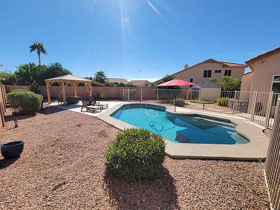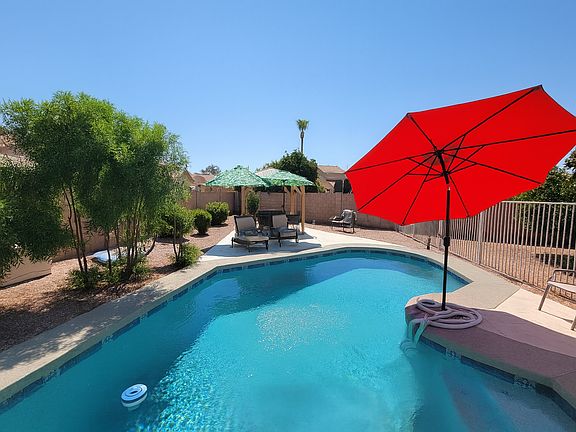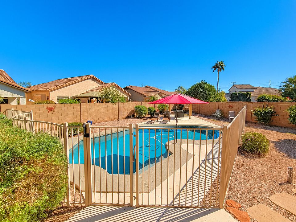 Step outside to your own private Arizona oasis, featuring a sparkling swimming pool, low-maintenance landscaping, and an expansive covered travertine patio ideal for outdoor dining and lounging. Enjoy worry-free living professional pool service and landscaping are included in the rent.
