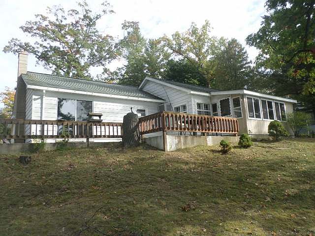 Dodge Lake waterfront home with beautiful full lake view and sunsets too. Wonderful sandy frontage for swimming and dock for the boat. Nice deck overlooking the water. A mix of old and new inside awaiting your vision. Large room needs drywall and flooring which will make a great family room or bedroom. Attic has tons of storage. Nice level lot with plenty of room for parking and large shed for the outdoor furniture.