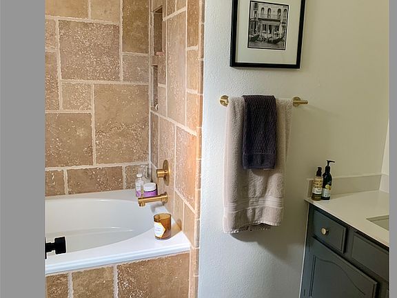 The bedroom currently has a king sized bed, and master bathtub and shower.