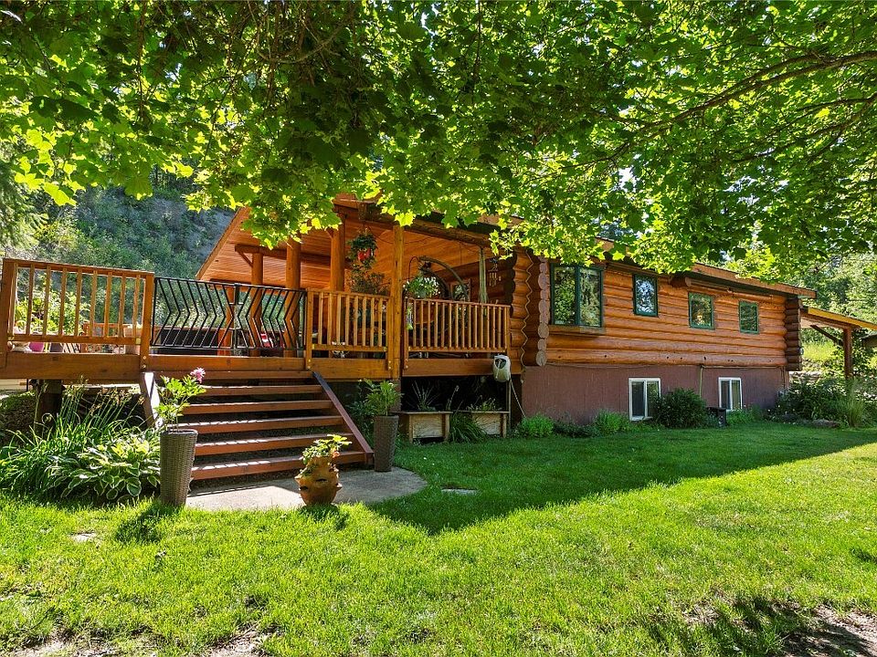 Embrace the essence of refined rustic living in this picturesque log home set on a sprawling 1.03-acre parcel. Nestled on a secluded lot, this magnificent residence offers a harmonious blend of timeless sophistication and contemporary comforts. The pristine main level showcases a luxurious master retreat, featuring an opulent 5-piece spa-like bathroom with a freestanding tub and a deluxe walk-in shower. The luminous living space is flooded with natural light, highlighting the gourmet kitchen with its exquisite island, high-end gas range, and abundant custom cabinetry. Step outside to the grand partially covered deck, ideal for year-round enjoyment. The lower level unveils two additional bedrooms, a cozy family room, and a versatile summer kitchen, presenting an opportunity for a potential in-law suite. Graced with mature landscaping that envelops the estate in natural beauty, this property epitomizes a serene oasis. Boasting a spacious carport and ample parking, including RV/boat space, this exceptional home offers a rare fusion of seclusion, luxury, and outdoor splendor, creating an unparalleled retreat for the discerning buyer.
