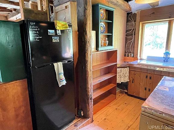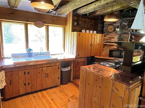 Settled on the shores of Michigamme River's Silver Bay, this log cabin is a true work of art. Original to the 1940's the main cabin has been added on to with style and functionality. The main floor is open with wide plank wood floors and exposed beams, a step down to the dining area giving the space its own definition and the character throughout the space is like no other. A wood burning fireplace is centered in the brick wall creating a beautiful focal point to the space. The kitchen has copper clad counters and a vintage porcelain sink. A half bath completes the main floor. The upper level has a spacious bedroom with 2 closets and views of the bay. The lower level is a walk out and includes the original structure with 2 additional bedrooms, 2 enclosed porch areas and a den with the second wood burning fireplace. There is also a huge family room looking out over the bay with large boulders as part of the structure and an adorable .75 bath/utility room. Just out the lower level you can easily access the detached 2 car garage which has a pit for easy access to repair the undercarriage of a car!