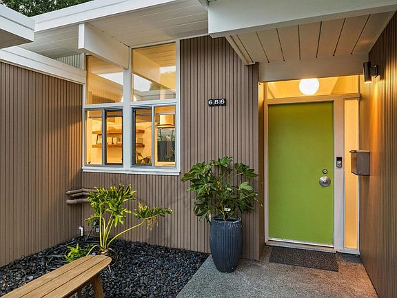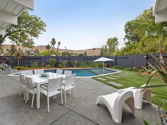 Step inside this mid-century modern showpiece and prepare to be wowed by soaring 10-foot walls of glass framing views of lush tropical landscaping. Anchored by a dramatic cinder block fireplace and glowing with original Eichler globe lights, this home celebrates both classic design and modern upgrades. Dual-pane windows, custom shades, a remodeled open-concept kitchen, and brand-new luxury vinyl plank flooring create the perfect blend of timeless style and modern comfort. Cook with flair on your induction range, gather around the expansive living room for cozy nights by the fire, or head outdoors to enjoy patios designed for lounging and dining. The sparkling resurfaced pool invites year-round fun, while irrigated lawns, garden beds, and even a chicken coop make this property feel like your own private oasis. With remodeled bathrooms, an upgraded boiler, and a foam roof, the home is both move-in ready and beautifully updated. Located on one of Terra Linda's most beloved streets, the neighborhood is known for its legendary Halloween trick-or-treat festivities, friendly community spirit, and close proximity to highly ranked schools, local restaurants, the community center with pool and park, and miles of open space trails.