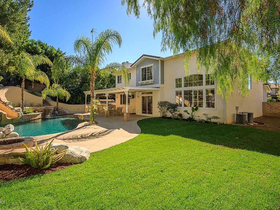 From the moment you step onto this property you know it is a 'WOW HOME'' with a DREAM COME TRUE ENTERTAINER'S BACKYARD!!! This SPECTACULAR home features a pebble-tec pool with 3 waterfalls, large spa. huge water slide built into the hillside, lava rock gas fire pit, large covered patio with 2 skylights and 2 ceiling fans, built-in BBQ, dining bar, mounted TV, sound system and lovely landscaping with a large grass lawn, GORGEOUS TROPICAL PALM TREES AND FLOWERS and much more!!!! The 5 bedroom/3 bathroom AMAZING home with an easy flow from room to room features a large kitchen, formal living room, formal dining room, family room (open to the kitchen) with fireplace, built-in entertainment center (including TV) and newly sanded/stained hardwood floor, spacious master bedroom suite and an office (that could be used as a 6th bedroom)! 2 Staircases, freshly painted, dual paned windows, recessed lighting and dual zoned HVAC - this home is MOVE IN READY!!! All this on a non-pass through street - and don't miss the HUGE gated covered RV parking with clean-out station! This one-of-a kind property offers THE VERY BEST OF INDOOR/OUTDOOR LIVING!!! HURRY TO SEE THIS ONE - IT WONT LAST LONG!!!