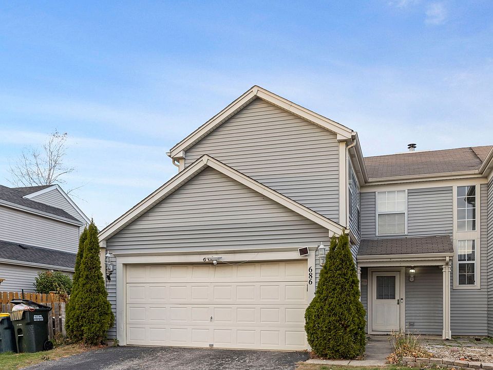 Step into a spacious foyer leading to a dramatic two-story living room with palladium windows and a cozy fireplace. This open-floor-plan duplex has a large kitchen with pantry and space for a table and chairs. Upstairs offers three bedrooms and two and a half baths, with cathedral ceilings in the primary and third bedrooms, plus a walk-in closet and private bath in the primary suite. Sliders open to a deck, fenced yard, and shed. Stainless steel appliances and a two-car garage round out the perks. No monthly association. This one won't last.