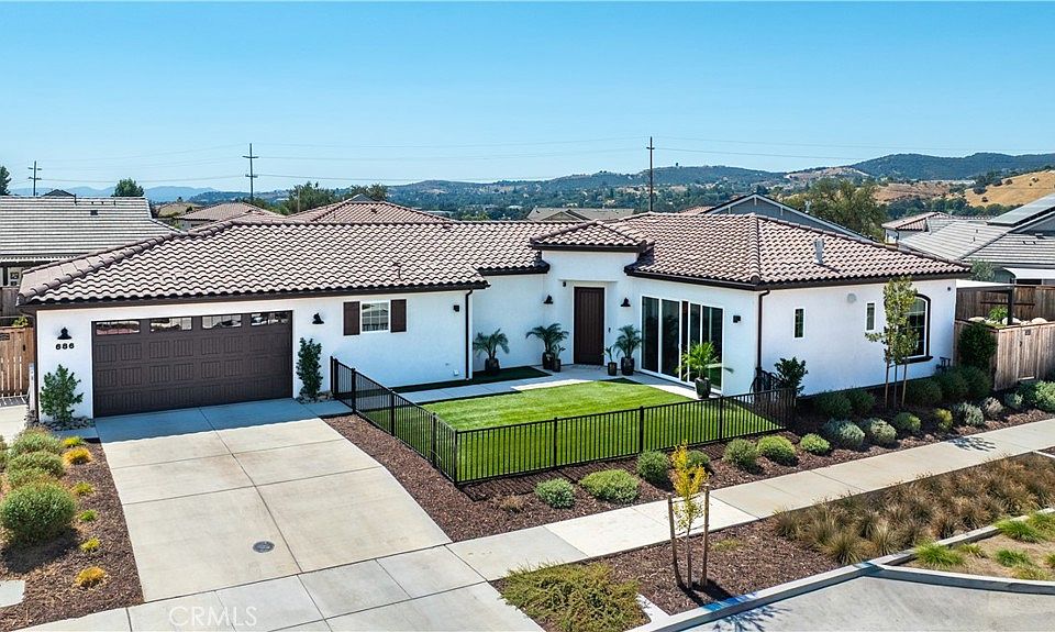 Welcome to Vintage, a highly sought-after 55+ community in the heart of Paso Robles wine country—where vibrant active-adult living meets relaxed luxury. At the heart of this home is a fully reimagined chef's kitchen - a complete redesign from the builder's original installation. Unlike what the builder offers as upgrades, this kitchen was completely reimagined with custom cabinetry, designer hardware, and professional-grade appliances, including a Viking cooktop, Viking double oven, Viking built-in drawer microwave, and an extended Calacatta quartz island with elegant waterfall edges. This one-of-a-kind space blends beauty and functionality in a way rarely available in the community. With over $255,000 in thoughtful upgrades, this residence was designed for both style and comfort. The open-plan living area captures both sunrises and sunsets filling the home with natural light throughout the day. The expansive backyard is professional landscaped to be eye-catching with low maintenance turf surrounded by palm trees and roses. The living space outdoors features a louvered pergola with LED lighting and electric heaters for year-round enjoyment and BBQ. With one of the largest lots in the neighborhood, there's room for a lap pool, traditional pool, or your dream outdoor oasis. Additional enhancements include motorized Lutron Palladium shades, an epoxy-coated garage floor, a WaterMax softener with reverse osmosis filtration, a tankless water heater, and an owned solar system with Tesla Powerwall-delivering both luxury and long-term efficiency. Beyond the home, Vintage offers a true resort-style lifestyle. Residents enjoy lively block parties, BBQ's, and outings to Paso Robles' world-class wineries and restaurants. Future planned community amenities include a clubhouse and swimming pool. Pickleball/Bocce/Pétanque Courts are now open and are just steps from your front door. Enjoy the convenience of River Oaks Golf Course and The Spirit of Paso Robles Restaurant just across the street, with the serene River Oaks Spa located right at the end of the road. This home is turnkey--luxury without the wait of new construction. Schedule your private showing today and discover why this residence sets a new standard for elevated living in Paso Robles wine country.