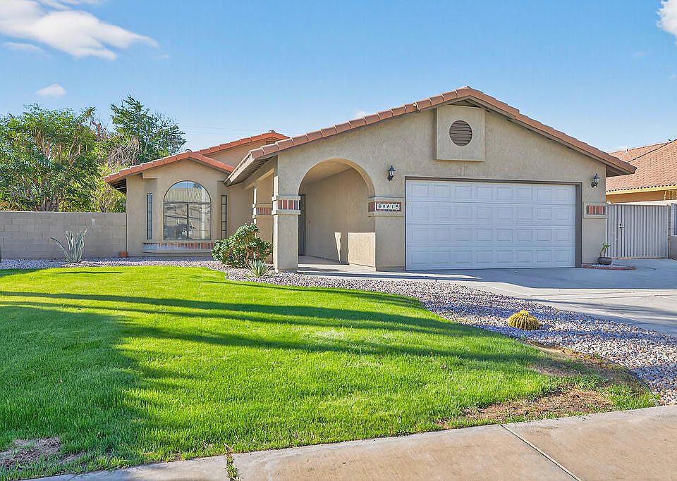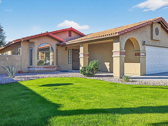 Come experience this bright, spacious, and newly updated 3-bedroom, 2-bath single-family home featuring vaulted ceilings and an open concept living area. With the perfect combination of comfort and convenience, this home has been recently renovated with fresh interior paint throughout. New carpet in the bedrooms and light floor tiles in the common areas add to a clean, modern feel. The kitchen features granite countertops with a functional layout and dining area, and large closets offer additional storage. The spacious primary bedroom includes a walk-in closet, ensuite bathroom, and direct access to the backyard, and two additional bedrooms provide flexibility for guests or a home office. Enjoy the newly planted grass in the front yard, and a large backyard with plenty of room for a pool, spa and ready for a new owner's design. Fully paid solar panels provide energy efficiency and lower utility costs. Conveniently located near Panorama Park, multiple golf courses, dining, and shopping. Don't miss this opportunity for affordable desert living!