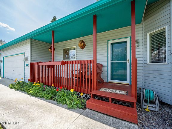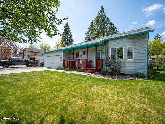This charming 3-bedroom, 2-bath home offers 1,296 sq ft of comfortable living space on a 0.17-acre lot. Enjoy the inviting front porch and vibrant garden beds, perfect for relaxing. The living room is bright and cozy with a large bay window, vaulted ceilings, and an open flow into the kitchen and dining area. The kitchen features skylights, ample counter space, and wood cabinetry. The split-entry layout includes a daylight basement with bonus space for a home office, hobby room, or den. Step outside to a private backyard oasis with mature trees, patio space, and a garden shed. The fenced yard and added storage are ideal for outdoor enjoyment and pets. The attached two-car garage and additional side parking offer plenty of space. Located in a quiet neighborhood close to local parks and schools, and less than 13 miles to downtown Coeur d'Alene, this home blends comfort, convenience, and charm in a desirable location.
