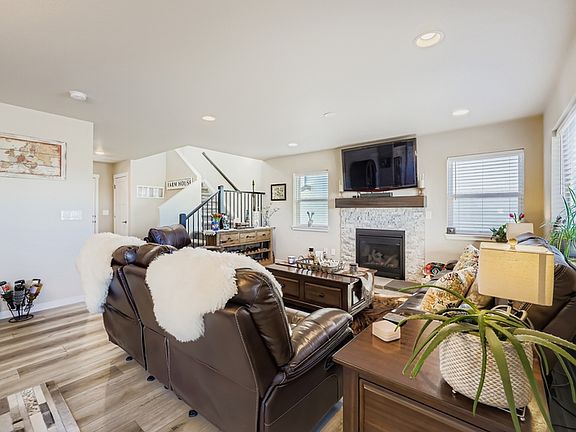 Gas fireplace with custom wood mantle, stainless steel appliances, gas range, gas line to main level deck, LVP flooring in kitchen and dining area, quartz countertops in kitchen and all baths, tile floors in all baths, composite decking with metal railing, 6ft cedar fenced back yard, landscaped front yard, and walkout basement! Energy efficient features with a home warranty are also standard!