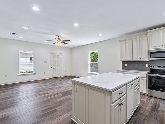 The interior features a spacious living and dining area filled with natural light. The kitchen is equipped with granite countertops, an island, and stainless appliances including an electric range and oven. The private primary suite includes a full bath and generous closet space. Two additional bedrooms and a second full bath provide flexibility for family, guests, or work-from-home needs. Durable flooring and energy-efficient features add comfort and value.