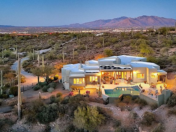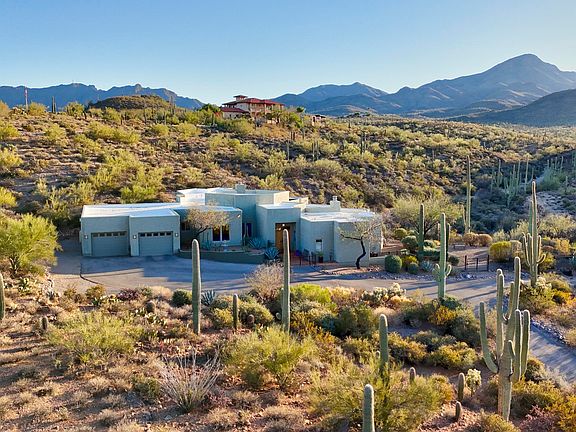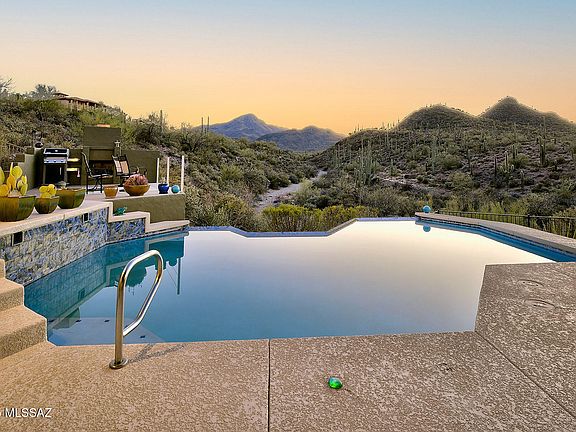 Your very own magical sanctuary awaits you, nestled on 4.06 acres in the foothills of Saguaro National Park West, with magnificent views inside and out, abundant wildlife, lush desert surroundings and all the amenities you expect in a southwestern style home. Inside fin 2,922 sq., find a lovely open floor plan, great room with fireplace, spacious remodeled kitchen, updated appliances, fixtures, counter tops, back splash, lots of custom cherry cabinets and counter space. The remodeled primary suite features sitting area, 2-way fireplace, bath with dual sinks, spa tub and separate shower offering new fixtures, tile, vanity and mirrors. Find two additional bedrooms plus office/bonus room, storage/workshop, dual cooling replaced in 2020 and 2024, extended garage and water softener. New roof in April of 2019, new asphalt driveway in 2021, renovated PebbleFina pool, retractable sunscreens on west patio, new water heaters in 2021, detached shed/workshop. A serene desert oasis with spaces for meditation and contemplation, including butterfly and zen gardens, gorgeous negative edge pool with fountains, deep covered patio, open deck with fireplace for viewing sunsets and starry nights and easy access to Saguaro National Park West.