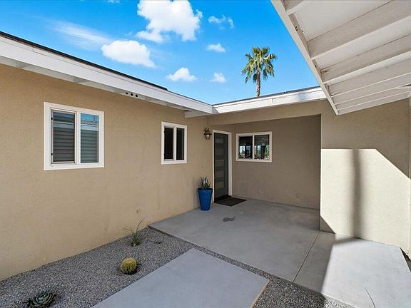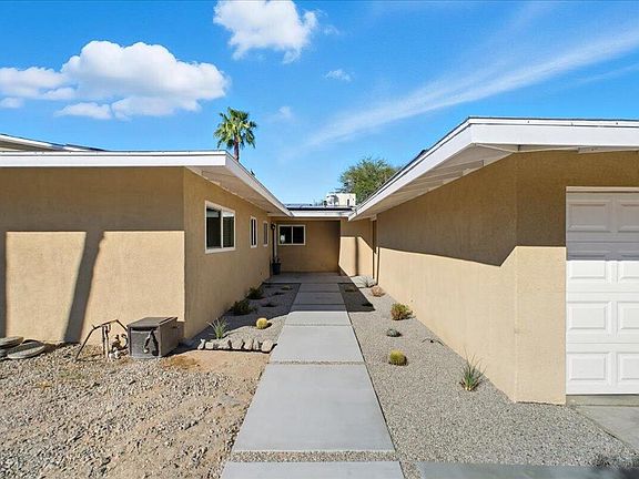 Mid-Century Modern ComfortWelcome to your desert retreat in the sought-after Cathedral City Cove--where mid-century charm meets modern comfort. This thoughtfully remodeled home offers two primary suites for ultimate flexibility and privacy, along with spacious living areas perfect for relaxing or entertaining.Step inside to find dual-pane windows, crown molding throughout, walk-in showers, and a modern kitchen featuring custom soft-close cabinetry, granite countertops, stainless-steel appliances, and a stylish mosaic backsplash--a space that blends contemporary design with everyday functionality. Energy-efficient leased solar panels (assumable by buyer) help keep utility costs low, and the home also includes a whole-house backup battery system for uninterrupted power during outages.Outdoors, discover an entertainer's paradise: a built-in BBQ kitchen with fridge, beer tap, and TV, plus integrated speakers, ceiling fan, and patio heaters beneath the awning--ideal for year-round enjoyment of mountain views and stunning desert sunsets. There's even ample space for a future pool if desired.Just minutes from downtown shops, restaurants, and the theater, this home blends classic character with everyday convenience. Come see why it's the hidden gem of the Cove--you'll want to stay and make it your own.
