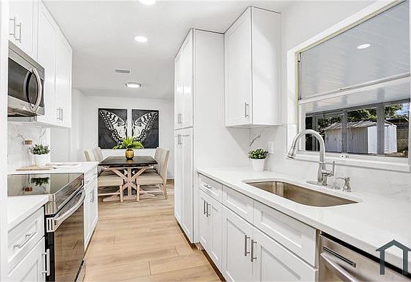 Privacy fenceQuartz countertopsCustom stone patio areaRemodeled bathroomsItalian porcelain tile showersRemodeled kitchenStainless steel appliances