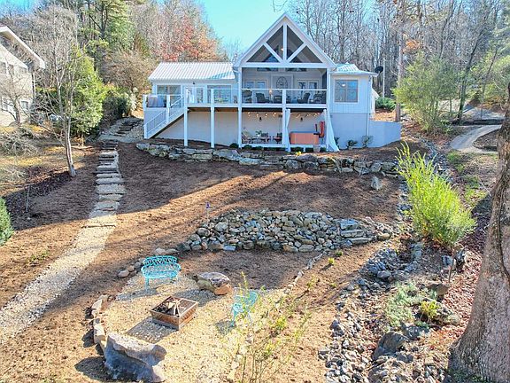 Charming Cottage on Lake Chatuge featuring 3 bedrooms and 2 baths. The grounds boast mature landscaping with lots of rock and stone throughout, paved driveway, 2-car timber frame carport, concrete board siding and metal roof create tons of curb appeal from the moment you arrive. As you enter the front door there is a spacious entry into a large open concept kitchen, dining and living with vaulted wood ceilings. A large pantry/laundry room is just off the kitchen. The kitchen has great light enhancing the beautiful farm sink, expansive counter space; great for prep and entertaining, eat-in kitchen island and custom cabinetry. There are 2 guest suites; one with an en-suite bath and the second utilizes a 1/2 bath. The primary suite is huge with year-round lake views, vaulted ceiling with wood beams and access to the back deck. The en-suite bath is stunning with marble tile floors, custom tile shower and vanity as well as a large walk-in closet. The home's additional features include plantation shutters, hardwood floors, gas fireplace, screened porch, hot tub, fire pit, lakeside swing and private dock. The dock has 1-3 feet of water in winter. This Lake Chatuge Charmer was totally remodeled in 2018-2019. Active vacation rental since 2020. This property has everything you could need or want in a lake home. Offered Furnished minus a few exclusions-see list available. Schedule your showing today.