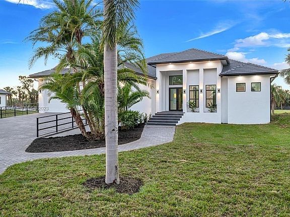 This spectacular house in 2.5 acres,the 4ft STEM WALL. LUXURY 4 Bed+3 1/2 bath, this home represents the true new NAPLES lifestyle with a perfectly designed pool and spa, a gourmet kitchen with stainless steel appliances, a pofiller, and large kitchen island with a wine cooler and walk-in pantry. This unique pet shower and extra-large laundry room, designer LED lighting throughout the house, a reverse osmosis system, and impact-resistant garage doors. The primary bedroom features a large dual shower with porcelain tile, frameless floor-to-ceiling shower glass panels, and a free-standing tub. Lush Florida landscaping and a fully equipped exterior kitchen.You will also be able to enjoy a private walking and exercising trail on the back of the lot of approximately 1, 000 ft.