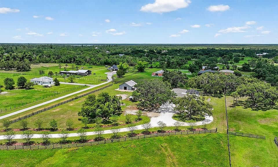 PRICE IMPROVEMENT! Welcome to your private retreat in the heart of Myakka Valley Ranches! This beautifully updated 4-bedroom, 3-bathroom, 3,024 sq. ft. pool home with a large den/office (easily convertible to a 5th bedroom) and an oversized 2.5-car garage offers the perfect blend of comfort, functionality, and rural charm. Set on a spacious 6.27 acres of fenced land with a 4-stall barn, it’s ideal for equestrian or animal lovers seeking room to roam. Inside, you’ll find thoughtful upgrades throughout. The home features new vinyl plank flooring (2025), new hurricane-rated windows (2025), a new roof (2024), whole-house reverse osmosis system (2024) and the entire house was previously re-plumbed—offering modern peace of mind and exceptional water quality. Two new A/C units were installed in 2021, and the pool equipment was replaced in 2020. The chef’s kitchen is as functional as it is beautiful, with solid wood cabinetry, pull-out shelving, a large island with prep sink, and two garbage disposals...perfect for the culinary enthusiast. The kitchen and covered patio are both plumbed for gas appliances, offering a seamless opportunity to build your dream outdoor kitchen. The home also includes a gas fireplace, central vacuum system, security system, double laundry sink, double-insulated exterior doors and sliders, and lighted wood-shelved closets in every room for abundant storage. One of the dual master suites features wheelchair-width doorways, making it ideal for multigenerational or accessible living. Step outside to your screened-in pool and spa, featuring automated color-changing lights, a gas heater, and a convenient pool bath. There’s even a dedicated patio closet for floats and pool equipment. The property’s 250-gallon propane tank was installed in 2025, and the home has never flooded. Located in Myakka Valley Ranches, one of Sarasota’s most picturesque equestrian communities, the neighborhood is made up of approximately 280 homes, each situated on at least 5 acres, with winding roads and scenic nature trails perfect for walking, biking, or horseback riding. Despite the peaceful, country setting, you're just 40 minutes from downtown Sarasota and a even shorter drive to Siesta Key’s award-winning beaches, with top-rated restaurants, shopping, and excellent public and private schools. This exceptional property isn’t just a home—it’s a lifestyle. Come experience the space, serenity, and freedom of “the Valley.”