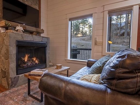 The interior is inviting and thoughtfully designed for comfort. The living room showcases a stone fireplace, creating a warm focal point for gatherings. Light interior walls paired with natural wood finishes enhance the sense of space and bring a bright, modern feel to the traditional cabin style.
