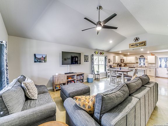 Get away from the city lights and escape to Texas hill country living in this affordable newer home. Enjoy the convenience of nearby amenities and entertainment while living in a tranquil rural setting. This spacious kitchen boasts a functional island, complemented by granite countertops. High ceilings, an open concept layout, and stylish stained concrete flooring throughout create a modern and inviting ambiance. Abundant storage space and a robust Tough shed are also available to cater to all your storage requirements. Two rain barrels to collect water for irrigation also will convey. Schedule a showing today and envision yourself calling this beautiful property 'home'.