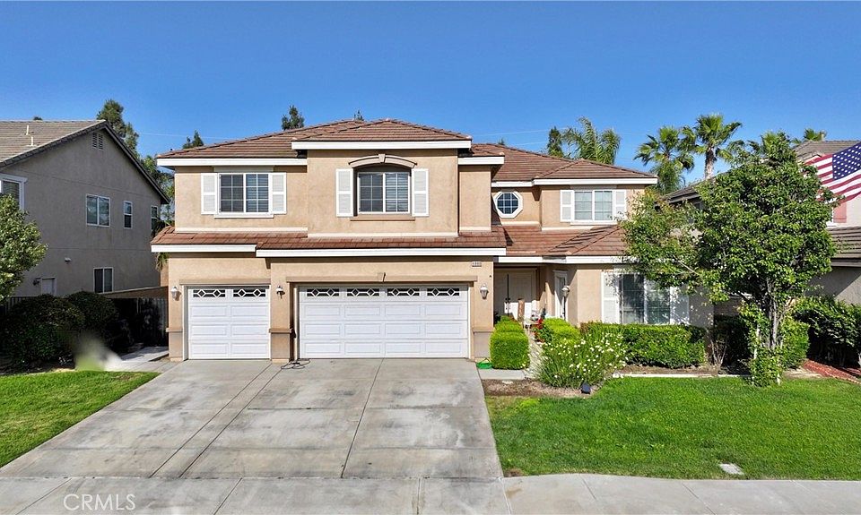 Beautiful executive home with casita, located in a highly desirable neighborhood of Eastvale. 6 bedrooms, 4.5 bathrooms. The main house has 5 bedrooms, 3.5 bathrooms (1 bedroom, 1.5 bathrooms downstairs) plus a home office, 3 car attached garage. Double door entry leads to a high ceiling grand entrance. Super large living room and formal dining room. Open concept kitchen with center island, breakfast bar and granite counter tops, appliances including built-in microwave. Large walk-in pantry provides extra storage. Family room with fireplace and media niche. Laundry room with sink and cabinets. Upstairs features 4 bedrooms, plus a large bonus room that could be another entertainment zone. Master bedroom with master retreat area, his-and-hers walk-in closets. Master bathroom with double sinks, shower and separate soaking tub. Casita suite (1 bedroom and 1 bathroom) at front yard with separate entrance. Other features include new interior custom two-tone paint, carpet in the bedrooms, laminated wood flooring from stairs to upstairs hallway. Custom two-tone paint, custom window wood shutters and blinds, and recessed lights. Professionally landscaped backyard with palm trees. Centrally located in the heart of Eastvale. Minutes away from shopping centers, restaurants, schools and parks. Convenient access to major freeways.
